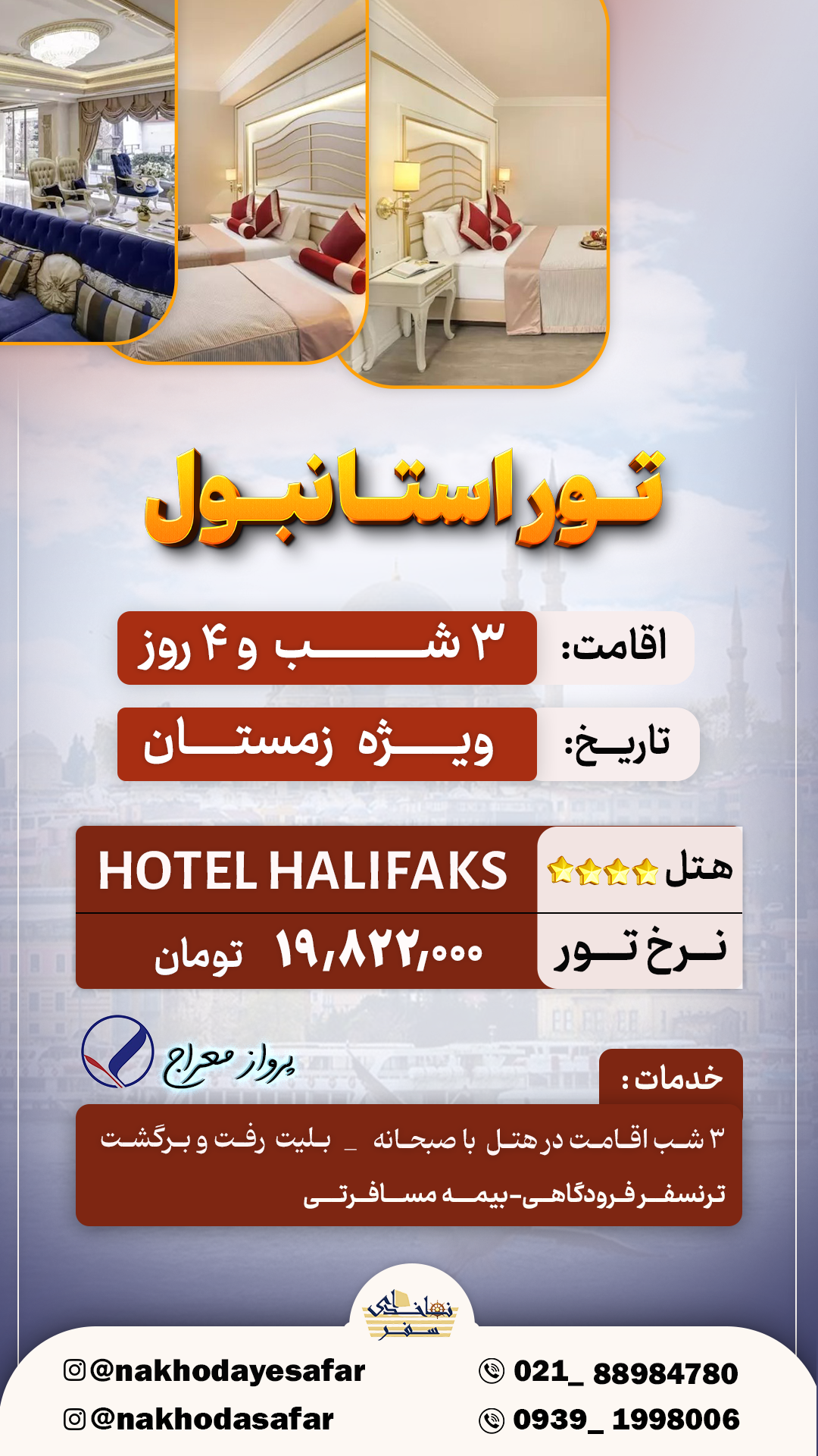 - خدمات تور: بلیط رفت و برگشت + ۳ شب اقامت همراه با صبحانه + ترنسفر فرودگاهی + بیمه مسافرتی
