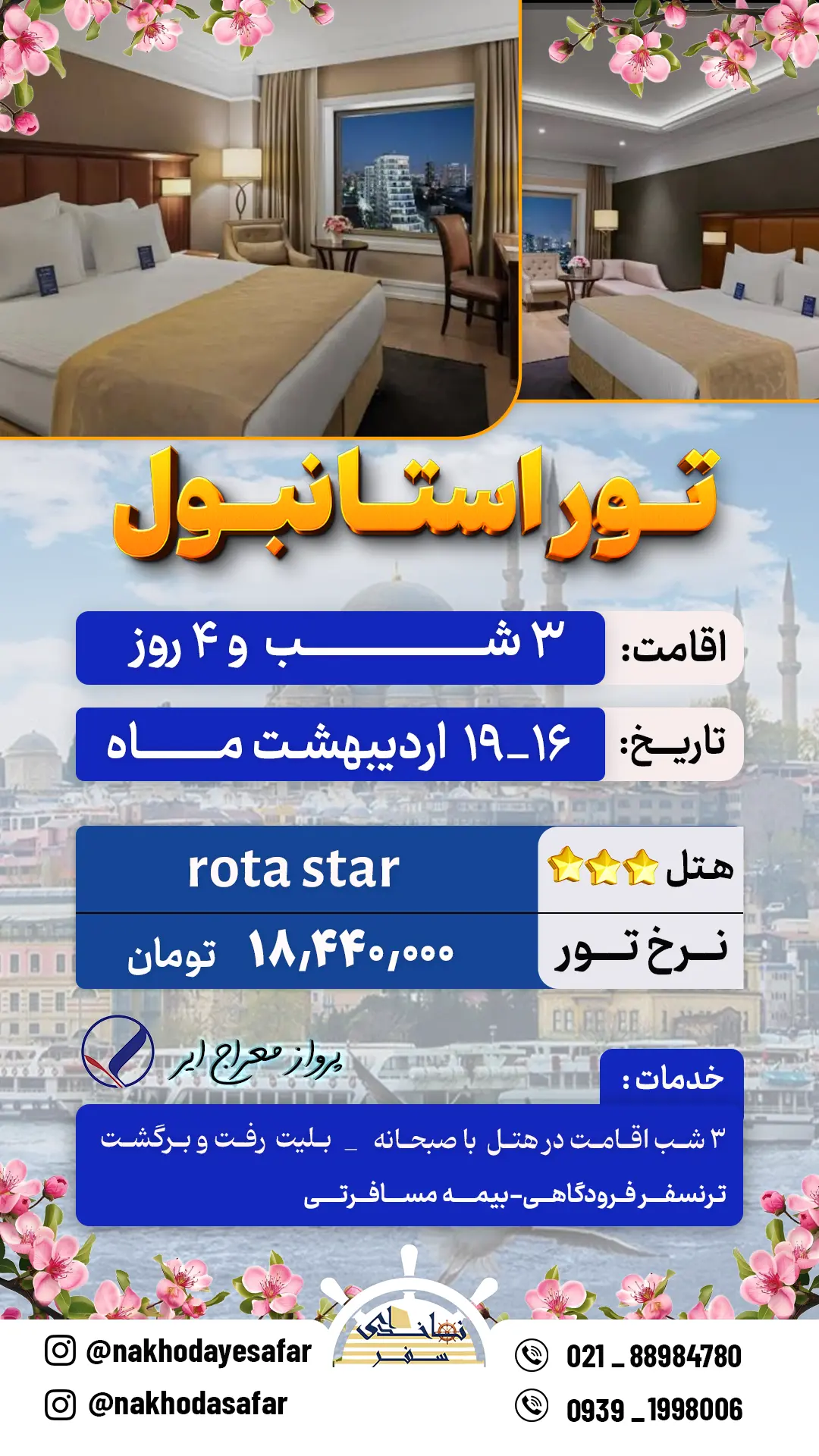 نرخ بسیار ویژه و انحصاری، در صورت درخواست سایر هتل و اطلاع از سایر آفرها با ناخدای سفر تماس بگیرید.<br />