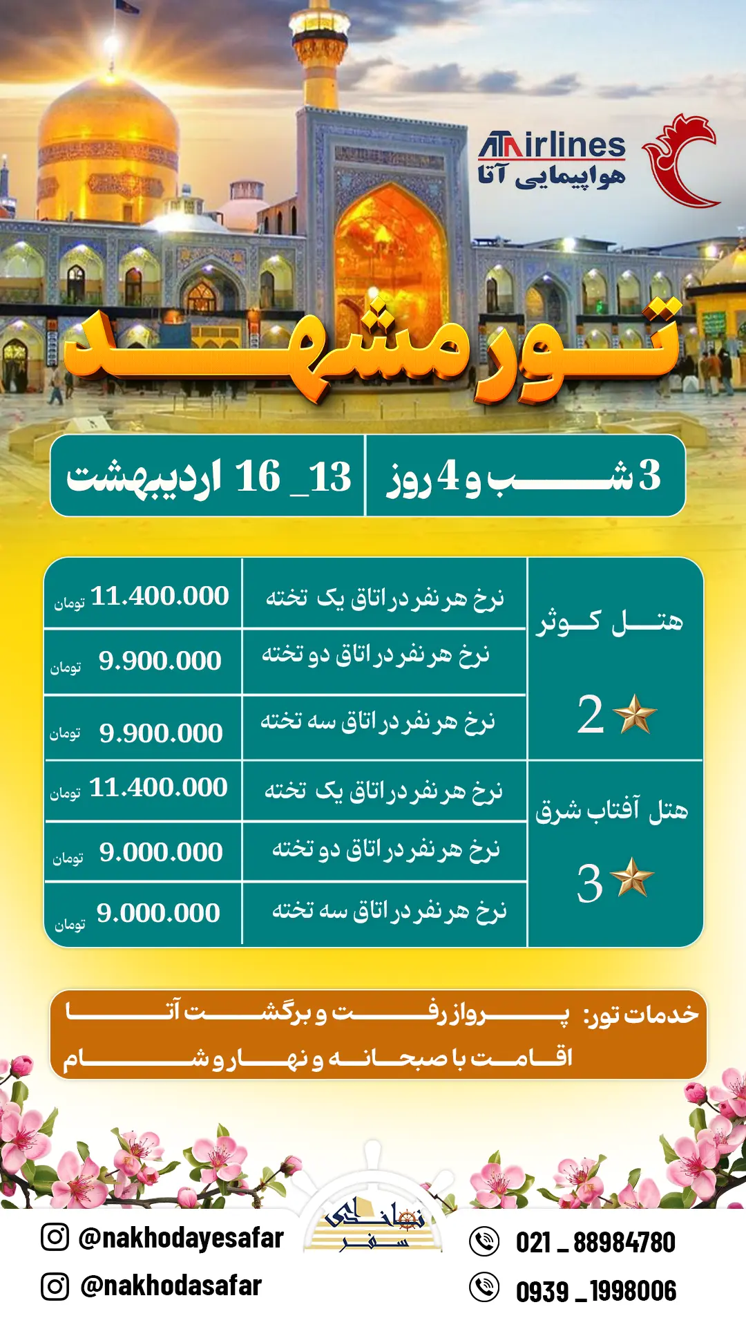 خدمات تور: - بلیط رفت و برگشت هواپیمایی آتا