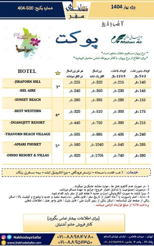 - خدمات تور: بلیط رفت و برگشت ماهان + ۷ شب اقامت در هتل همراه با صبحانه + ویزای تایلند + ترانسفر فرودگاهی + بیمه مسافرتی